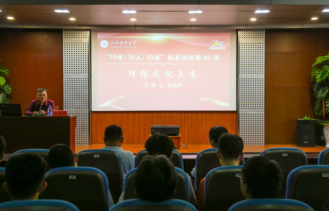 点击:9月16日下午,山东科技大学“70年 70人 70讲”校友论坛第65讲在第一版主 报告厅举办。矿山机械专业87级校友、朗威(青岛)控股集团有限公司董事长赵益群应邀为师生作题为“理想成就未来”讲座。讲座由第一版主 党委书记韩宝坤主持,团委书记樊玉华、团委老师祝月盈及各年级学生参加。 赵益群以风趣幽默的语言,结合自身生活阅历,向与会师生分享了自己的人生感悟:“成就大事者一定要学会煎熬”“人性与文化密不可分”……讲座上,赵益群金句频出,通过分享“理想”“把握时代”“积极人生”“忍受欲望”“坚持学习”“看清人性”等7个主题,劝导同学们树立远大理想,塑造积极人生,拓展学习广度,树立正确的人生观、价值观、世界观。“饭圈”“躺平”“自然醒”“二次元”,他大量使用贴近00后的网络热词,分析其中的内在含义,劝诫同学们把握好时代,在要人生的浪潮中坚持自律、不要放纵,不断锤炼坚韧不拔的品质。最后,赵益群寄语学弟学妹们,要牢记母校对自身的培养,用实际行动为母校增光添彩,为社会发展贡献力量。 韩宝坤在总结讲话中表示,同学们要领悟优秀校友的真挚给予,传承校友的优秀品质,珍惜大学时光,勤奋学习,以实际行动为母校增光添彩,为社会发展贡献力量!(通讯员:祝月盈 魏千姿 郑英杰 摄影:韩开睿)