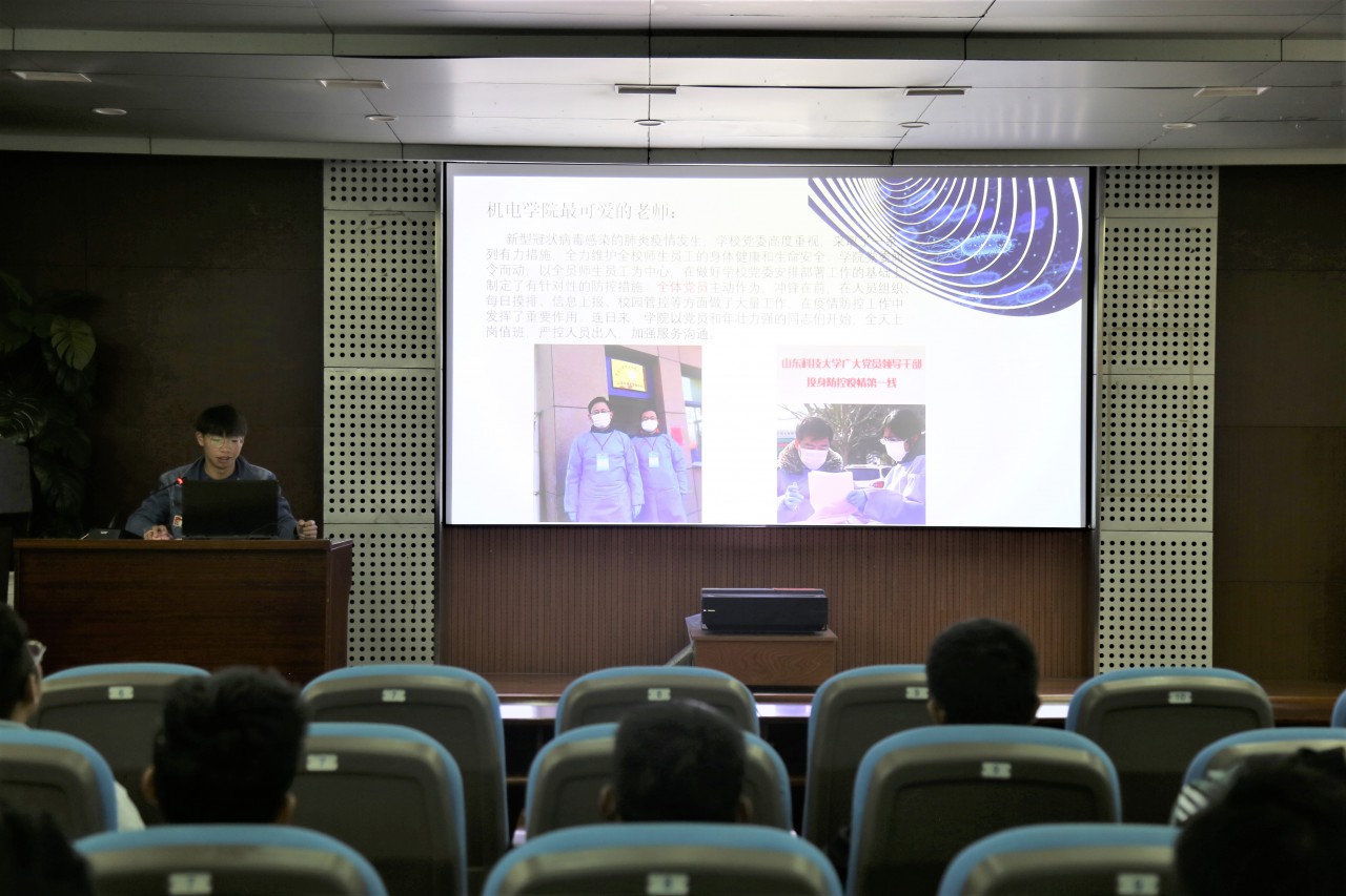 王正江介绍了第一版主 师生在疫情期间为学校、社区疫情防控进行的各项工作,特别讲述了机电学子在疫情期间积极参加各项志愿服务活动的优秀事迹,通过分享自身暑假时间到临沂市蒙阴县参加了“三下乡”社会实践活动,采访当地公安机关、社区网格化工作人员的所闻所感,向与会同学呈现了青年学子在疫情当中不畏艰险、共克时艰的精神。