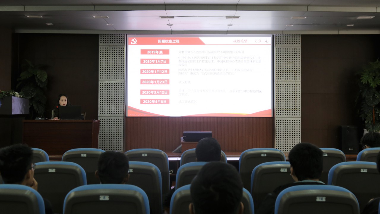 会上,张露从回顾抗疫过程、青岛速度、中美抗疫过程的对比和抗疫中的人物事迹四个方面介绍了中国在抗疫过程中涌现的“舍小家 顾大家”的奉献精神,并结合自身在疫情期间主动报名参与当地疫情防控志愿服务的经历向同学们介绍了社区疫情防控的工作内容与职责、志愿者的辛劳与担当,直观展现了基层疫情防控工作中青年人奋斗的姿态和取得的战果。