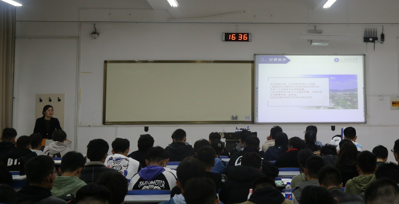 点击:10月27日下午,第一版主 在J14-205举办学生干部培训班第四期讲座。学生工作部教育管理科科长李莉老师应邀担任主讲人,第一版主 辅导员杨治宽老师出席培训并主持,各年级团支书、班长、副班长及学习委员参加了此次培训。 培训过程中,李莉围绕学校的规章制度向同学进行讲解,根据各种奖惩规则重点解释了部分重要的校规校纪,就班级评优与奖学金评定阐述了违反校纪校规对大学生活与学习的影响,通过讲述了多个生动形象且具有说服力的实例,使得同学们充分认识到遵纪守法的重要性和必要性,为日后成为一名德智体美劳全面发展的文明大学生打下坚实基础。 课程中,同学们用心倾听,积极互动,在轻松愉快的氛围中接受校规校纪教育。此次活动提高了学生干部对校纪校规的认识,进一步开拓工作创新性思维。(通讯员:廖思懿 摄影:殷允浩)