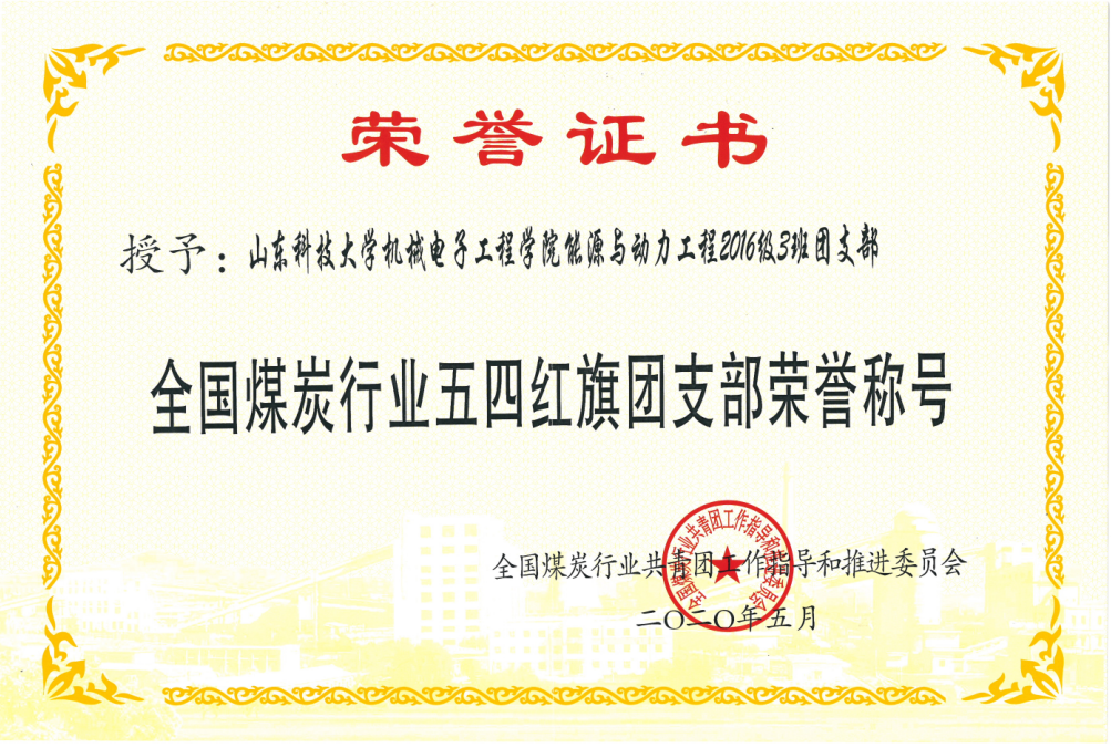 日前,全国煤炭行业共青团工作指导和推进委员会对2019年度全国煤炭行业优秀团委(团支部)、团干部和共青团员进行了表彰,第一版主 第一版主 能源与动力工程2016级3班团支部荣获“全国煤炭行业五四红旗团支部”称号。
