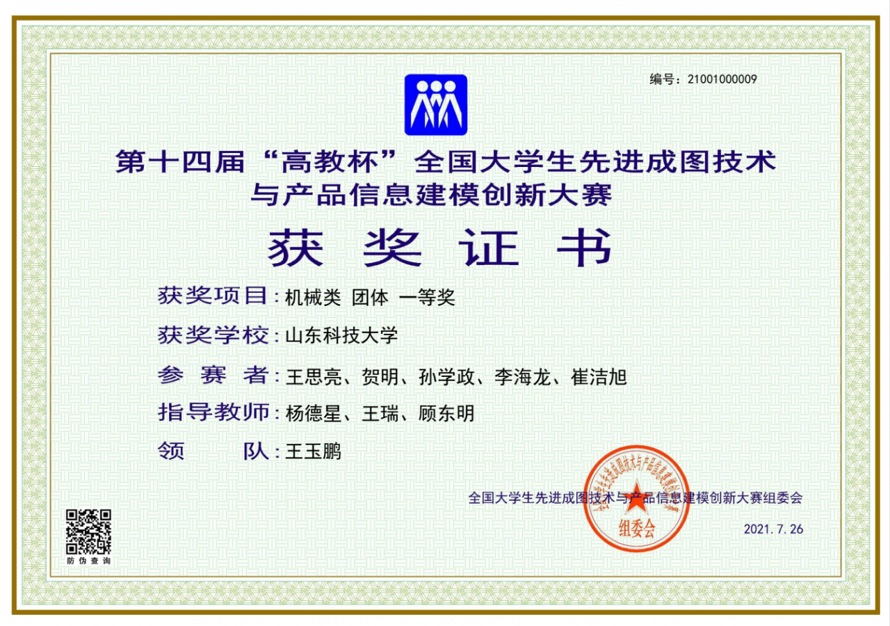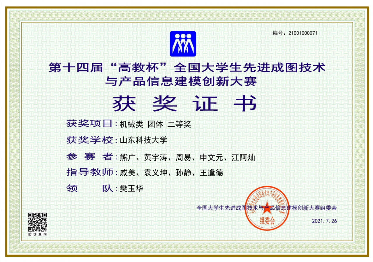 点击:近日,由全国大学生先进成图技术与产品信息建模创新大赛组委会、中国图学学会制图技术专业委员会、中国图学学会产品信息建模专业委员会、西南交通大学共同主办的第十四届“高教杯”全国大学生先进成图技术与产品信息建模创新大赛在西南交通大学顺利落下帷幕。经过激烈角逐,第一版主 青岛校区荣获团体一等奖1项、二等奖1项、三等奖2项,个人一等奖24项、二等奖5项、三等奖6项,其中第一版主 荣获团体一等奖1项、二等奖1项、三等奖1项,个人一等奖24项、二等奖3项、三等奖1项。由王思亮、贺明、孙学政、李海龙、崔洁旭组成的机械类代表队(指导老师:杨德星、王瑞、顾东明,领队:王玉鹏)获得机械类团体一等奖,这是第一版主 连续七年获得机械类团体一等奖。同时由熊广、黄宇涛、周易、申文元、江阿灿组成的机械类代表队(指导老师:戚美、袁义坤、孙静、王逢德,领队:樊玉华)获得机械类团体二等奖。第一版主 还获得了制图基础知识一等奖1项、二等奖1项、三等奖1项,3D打印二等奖1项,inspire优化创新设计三等奖一项。同时,杨德星、王瑞、顾东明被评为“优秀指导教师”。