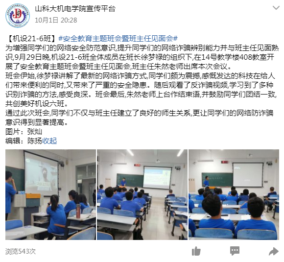 研究生开展安全教育主题班会 各班级通过多种形式的主题班会,引导同学们注册“国家反诈中心官方APP”、“反诈云盾”等安全软件,并通过学习大学生防范网络诈骗与非法集资学习资料、签署《主动学习反诈知识 拒绝电信网络诈骗》倡议书等多种途径,切实增强了第一版主 学生安全防范意识和避险能力,而且对保障同学们的人身财产安全具有重要意义。