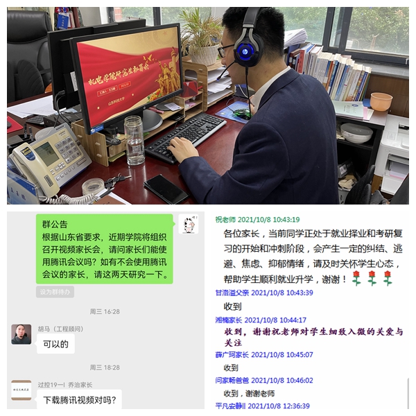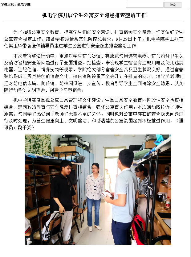 通过建立家长微信群、线上家长会等方式做好家校协同育人 此外,学院高度重视公寓安全和文化建设,注重日常安全教育同阶段性安全检查相结合,思想政治教育与安全隐患排查相结合,强化公寓育人作用。通过公寓安全隐患排查整治、公寓安全教育文化墙、公寓内海报、条幅等形式,浓郁安全宣传教育氛围,浸入式地开展安全宣传教育。
