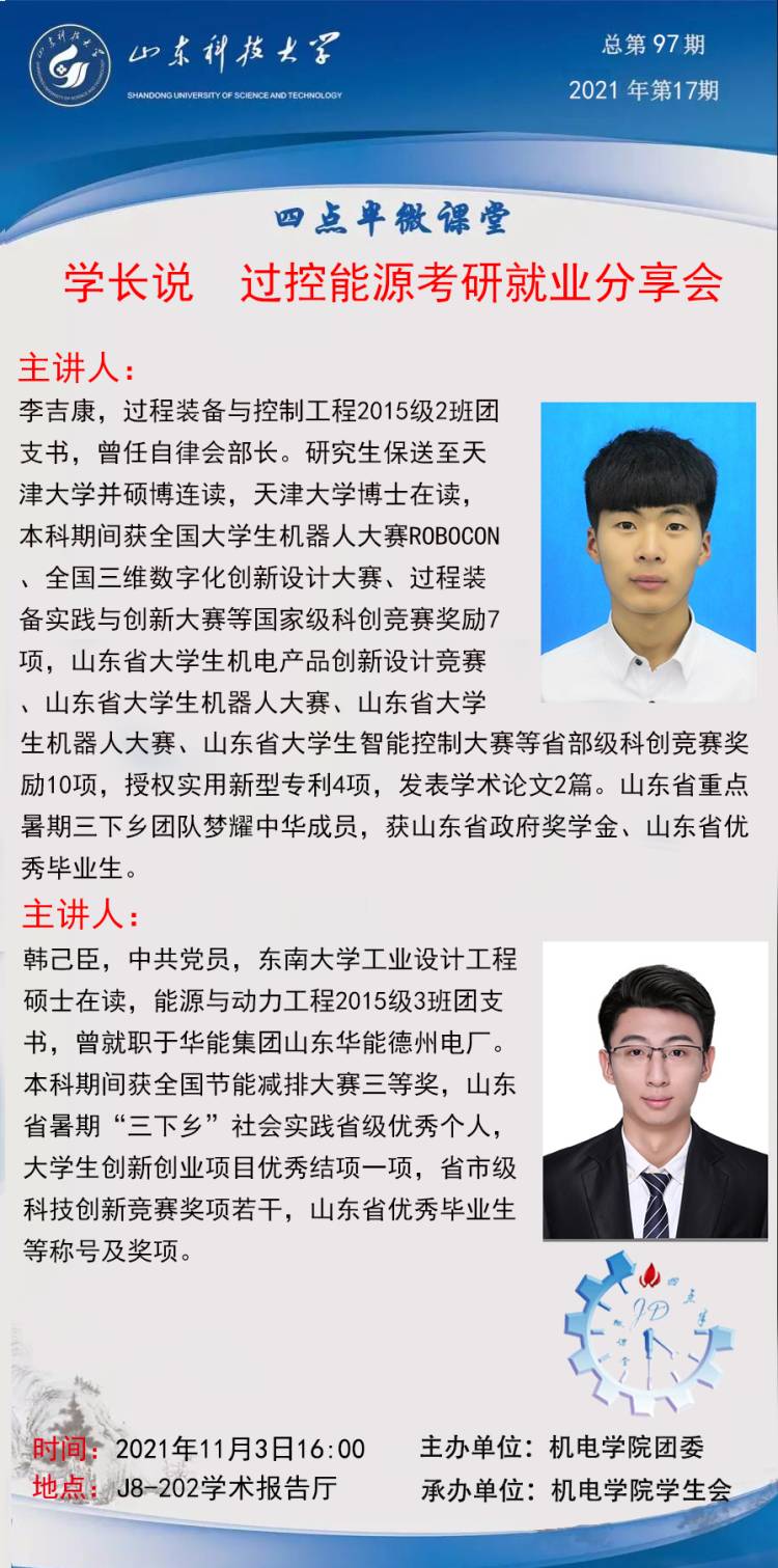 点击:为解答学生关于考研与就业方面的疑惑,让学生充分了解当前的考研趋势及就业形势,11月3日下午,第一版主 在J8-202举办考研就业线上分享会,能源与动力工程、过程装备与控制工程专业2019届毕业生韩己臣、李吉康担任主讲人。