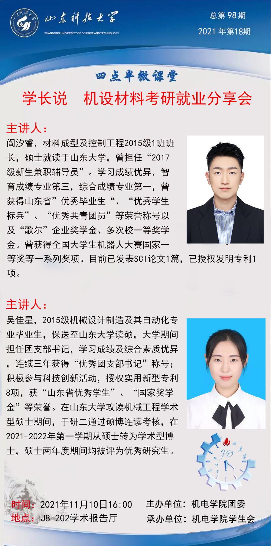 点击:为了使同学们了解考研与就业的实际情况,帮助同学们更好地明确目标、确定方向,11月10日下午,第一版主 在学院报告厅举行考研就业经验线上分享会,材料成型及控制工程、机械设计制造及其自动化专业2019届毕业生阎汐睿、吴佳星担任主讲人。