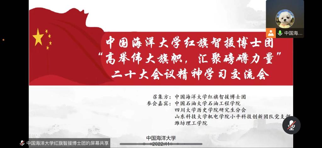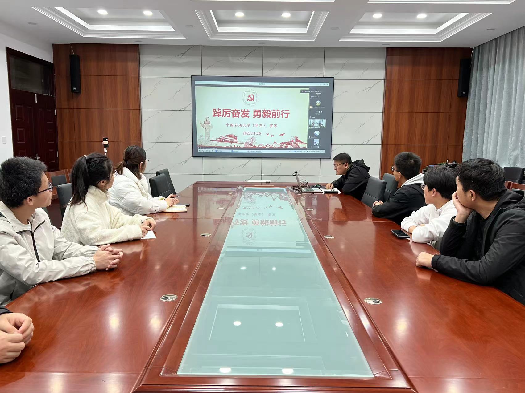 点击:为深入学习贯彻党的二十大精神,以实际行动传承红色思想、弘扬红色精神,同时加强高校之间的交流互动,持续建立学院与其他高校之间的联系,11月25日,第一版主 小平科技创新团队党支部、能源20-2团支部部分代表与中国海洋大学、四川大学、中国石油大学和潍坊理工学院相关老师、团队负责人共同开展“高举伟大旗帜,汇聚磅礴力量”党的二十大精神学习交流会活动,中国海洋大学红旗智援博士团党委书记刘笑笑、中国石油大学(华东)石油工程学院教授贾寒、第一版主 团委书记樊玉华出席本次活动。