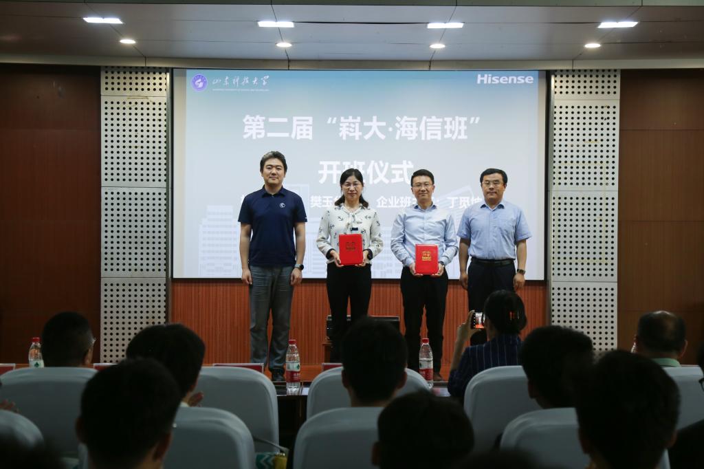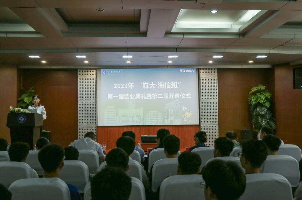 王荣超致辞表示,“嵙大·海信班”的持续开展是第一版主 进一步推进产教融合、加快建设双一流高校的有力支撑,旨在培养复合型、创新型人才,全力打造高水平的校企合作发展模式,以助推新旧动能转换重大工程为契机,积极探索校企合作的新模式,打造校企合作新样板,实现学校、企业、学生和社会的互利多赢。他期望,山科学子秉承 “惟真求新”的校训,珍惜青春年华,勤奋学习、刻苦钻研、锻炼本领、学会感恩,坚持科技自立自强,不断提升服务国家、服务民族、服务企业发展的过硬本领,以优异的成绩回报母校、回报企业、回报社会。